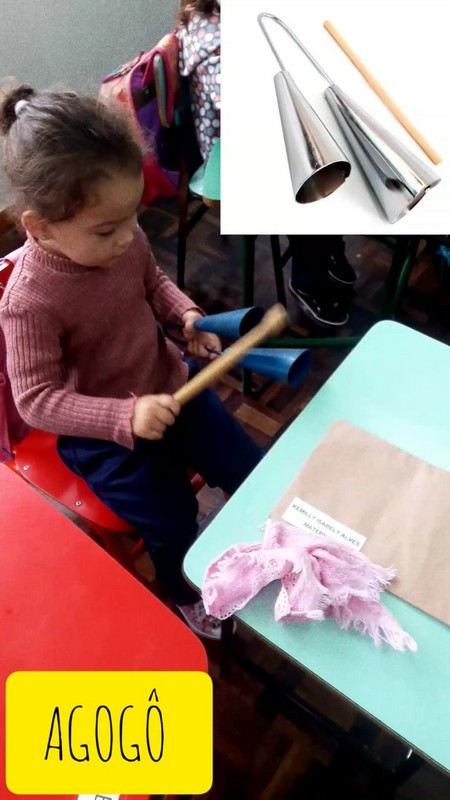 O som produzido pelo Agogô foi a novidade apresentada aos alunos do pré-escolar e maternal, gerando curiosidade e encantamento, emoções expressadas nos rostos das crianças ao tocarem pela primeira vez naquele instrumento. Essa experiência inusitada foi proporcionada pelo professor de Artes, Gabriel de Paula, aos alunos de turma bisseriada de pré-escola e maternal, na EMEB Augusta Vitória. O Agogô é um instrumento musical afro-brasileiro com duas campânulas de ferro percutidas por vareta de metal ou madeira.