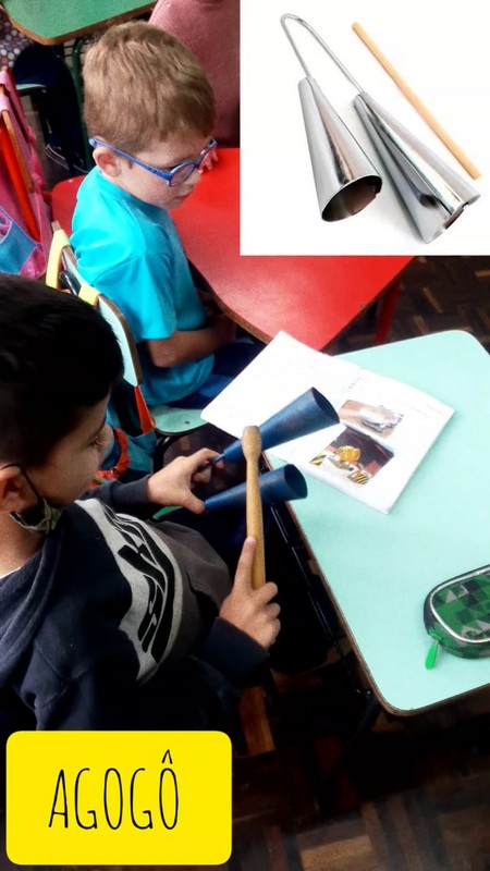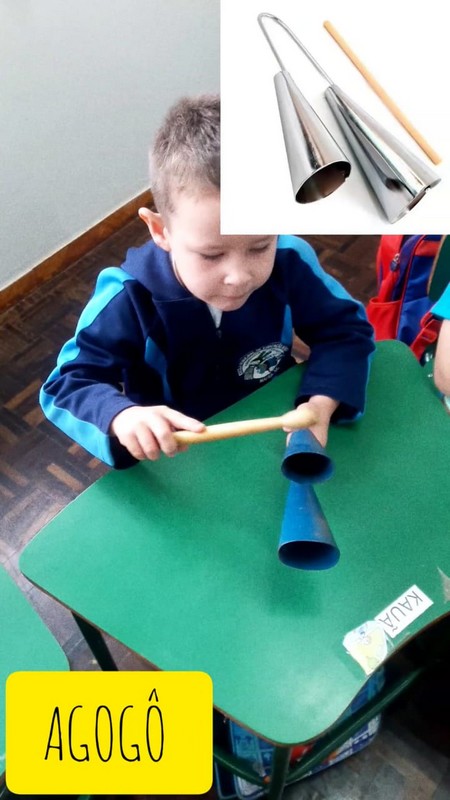 O som produzido pelo Agogô foi a novidade apresentada aos alunos do pré-escolar e maternal, gerando curiosidade e encantamento, emoções expressadas nos rostos das crianças ao tocarem pela primeira vez naquele instrumento. Essa experiência inusitada foi proporcionada pelo professor de Artes, Gabriel de Paula, aos alunos de turma bisseriada de pré-escola e maternal, na EMEB Augusta Vitória. O Agogô é um instrumento musical afro-brasileiro com duas campânulas de ferro percutidas por vareta de metal ou madeira.