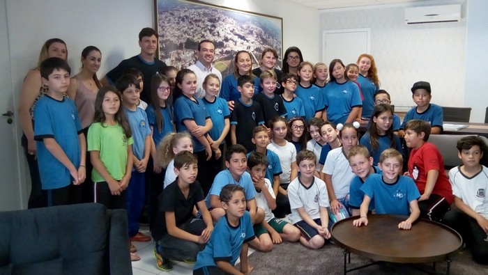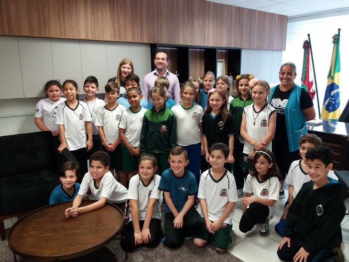 Alunos da EMEF Mário de Oliveira Goeldner visitaram na manhã da última quinta-feira (19), o prefeito Wellington Bielecki e conheceram um pouco do funcionamento da prefeitura. Eles pertencem as turmas do 4º e 5º ano que estão executando em 2017, o Programa “Um por todos e todos por um! Pela ética e cidadania!”, da Procuradoria Geral da União, desenvolvido em parceria com a Secretaria Municipal de Educação de Mafra, através da escola. O material utilizado na execução foi entregue pela CGU.
