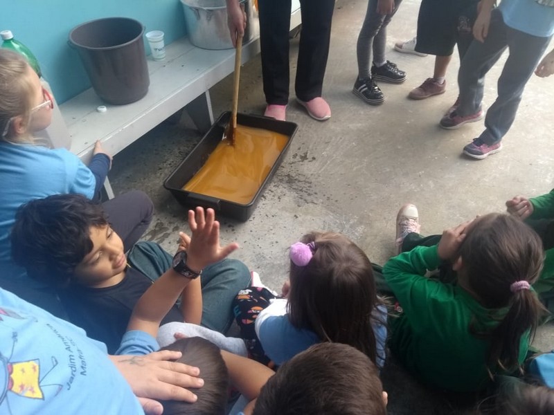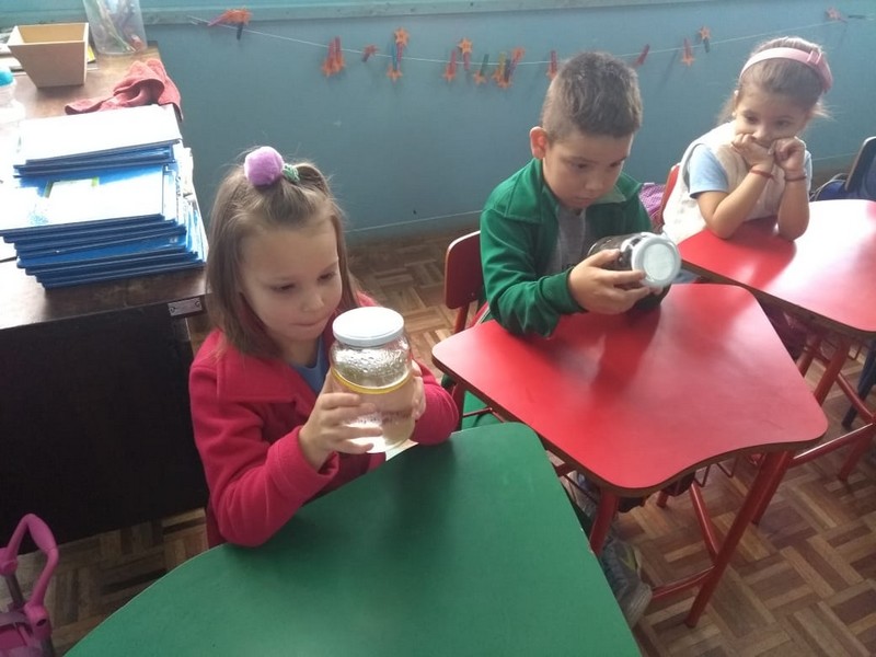 Esses dados chamaram a atenção da escola, que resolveu realizar um trabalho com as crianças, que levaram o aprendizado para casa e compartilharam com a família a experiência da confecção de sabão tendo o óleo como matéria prima. Para tanto foi convidada dona Gircelia Gaissler, avó de uma professora, que fez uma receita de sabão com a turma do Jardim II e cujo resultado será encaminhado para a casa dos alunos – cada aluno vai levar uma barra de sabão. Na atividade os alunos visualizaram a experiência água x óleo e terra x óleo, aprendendo sobre os prejuízos que o óleo descartado de forma incorreta causa ao meio ambiente.