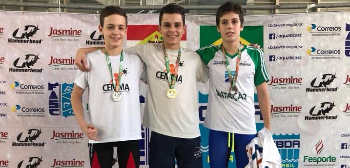 Representando o municÃpio de Mafra, na fase estadual dos JESC de Natação de 12 a 14 anos, com as provas sendo realizados no Complexo Aquático da Unisul na cidade de Palhoça, estes garotos subiram no lugar mais alto do pódio.