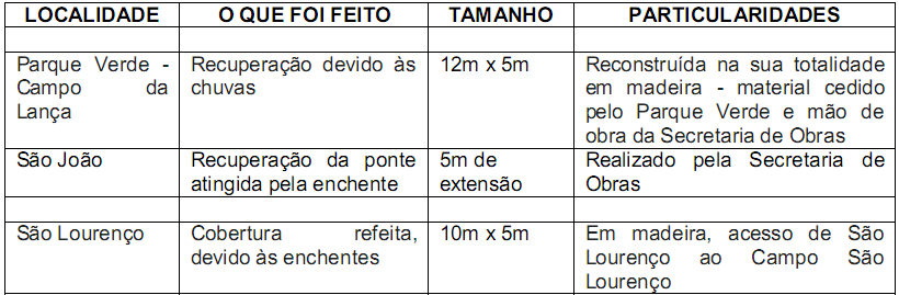 Também já foram recuperados 15 bueiros em diversas localidades. Outras pontes e bueiros estão sendo recuperadas, dentro de um cronograma estabelecido pela Secretaria de Obras.