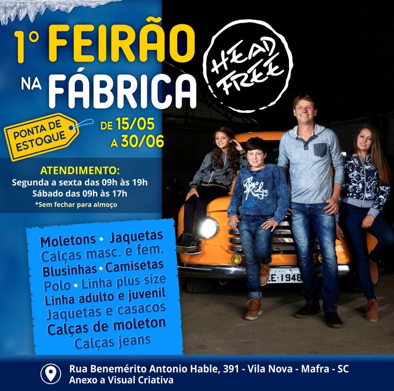 O Primeiro Feirão na Fábrica Head Free está sendo realizado em Mafra com uma grande variedade de roupas com preços especiais. Aproveite!