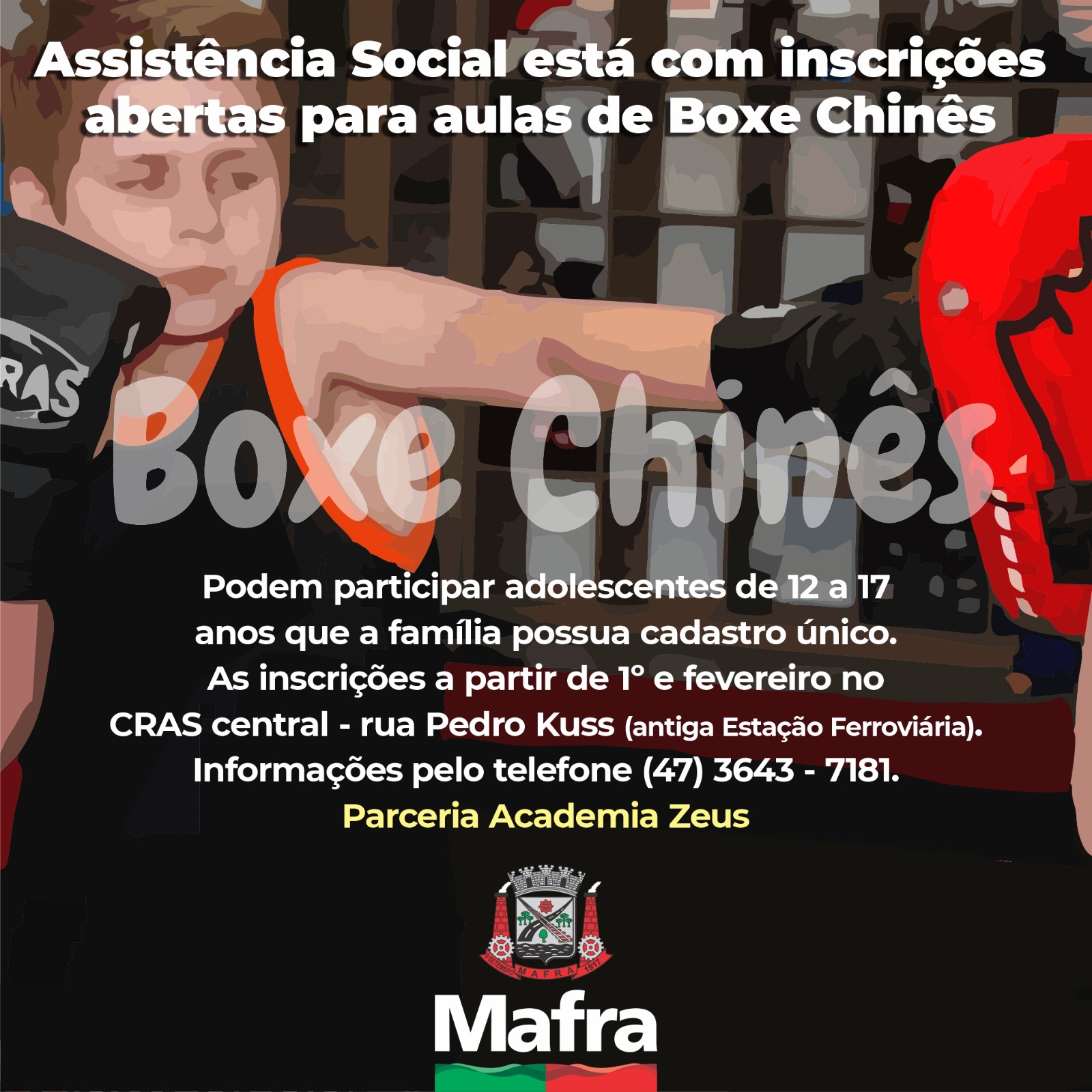 A Secretaria de Assistência Social por meio do programa Serviço de Convivência e Fortalecimento de VÃnculos (SCFV) está com inscrições abertas para aulas de Boxe Chinês. O Objetivo é incentivar o esporte, promover a socialização, trabalhar a disciplina e respeito que a arte marcial oferece. A ação acontece pelo segundo ano consecutivo em parceria com a academia Zeus.