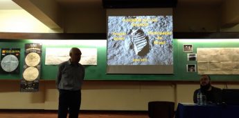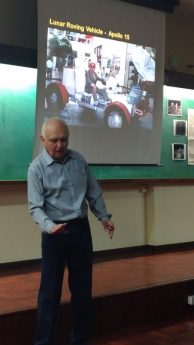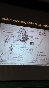 Para a palestra “O homem na Lua 50 anos – Projeto Apollo, Contribuição Brasileira”ele contou com um acervo de mapas e cartazes antigos identificando campos lunares, além de muitas fotos das diversas expedições do homem à lua, desde  as primeiras missões não tripuladas, em 1961 – Ranger, Lunar Orbiter e  Surveyor – até as missões tripuladas – Mercury,  Gemini e Apollo, esta ultima entre 1967 a 1972. Falou da 1ªmissão Apollo, que segundo ele “começou mal”, passando pela Apollo 11, quando efetivamente o homem chega a tocar o solo lunar, até a Apollo 17, que foi a última missão tripulada.