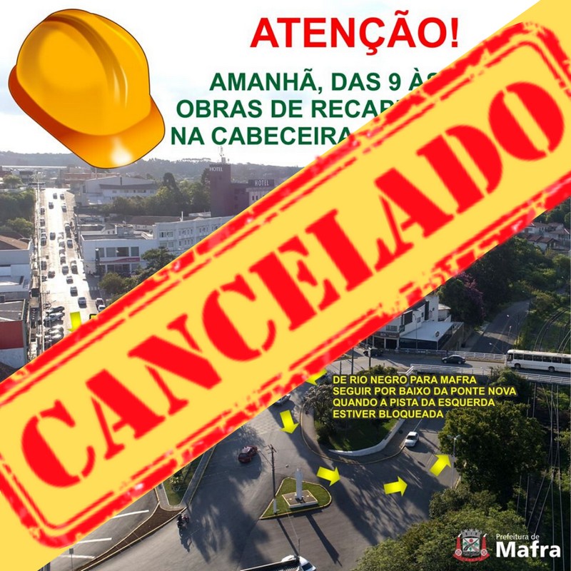 A Prefeitura de Mafra informa que as obras de recape asfáltico na cabeceira da ponte Rodrigo Ajace, que estavam programadas para a manhã desta quinta-feira, foram canceladas devido ao mau tempo. O trânsito permanece normal e nova programação será divulgada em breve.