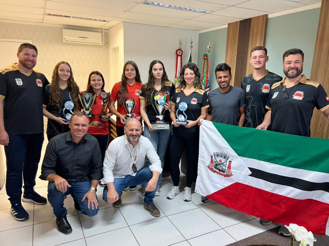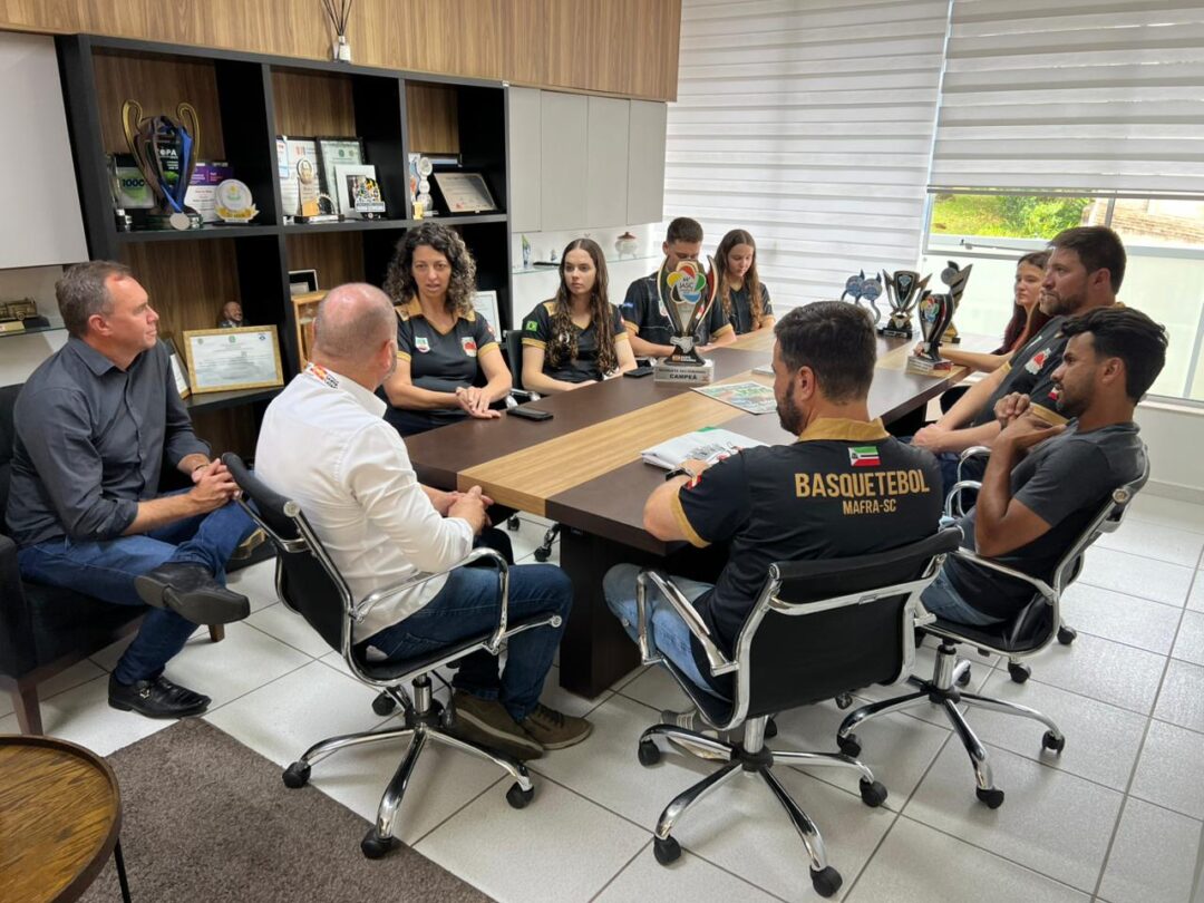 O gabinete do prefeito de Mafra vivenciou, nesta segunda-feira, 1 de dezembro, um encontro marcado pela celebração do esporte e pela projeção de novos caminhos para o basquetebol local. As atletas mafrenses, acompanhadas dos troféus conquistados recentemente, direção da Associação Mafrense de Basquetebol e do Vereador Rafinha foram recepcionadas pelo prefeito, Emerson Maas pelo vice-prefeito, Carlos Nitz. Também estavam na comitiva os treinadores Sérgio Luis Nunes, Normando de Souza, Anderson Rudnik, Yuri Gabriel Rudnik e Maria Rita Kovaleski que além de jogadora também é treinadora.