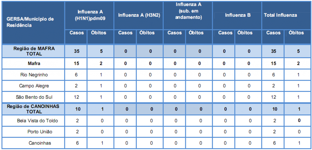 Até o final do mês, foram 14 casos de influenza A (H1N1) registrados somente em Mafra e dois óbitos seguidos do vÃrus. Na região, são 32 casos e cinco óbitos.