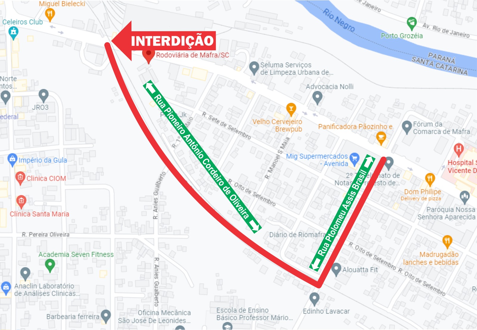 A Prefeitura de Mafra propõe desvios alternativos, como no sentido BR-116 e bairro Jardim América para o Centro, o motorista deve seguir pela Rua Ptolomeu Assis Brasil. Já para quem vai do Centro rumo BR-116, o desvio é pela rua Pioneiro Antônio Cordeiro de Oliveira. Pede-se a compreensão dos motoristas neste momento de adequações.
