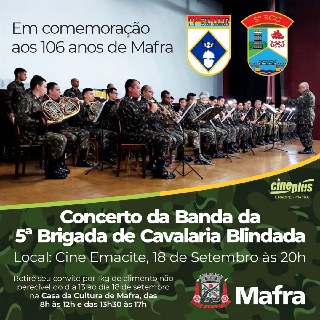Na próxima segunda-feira, dia 18, a Prefeitura de Mafra, por meio da Secretaria Municipal de Educação, Esporte e Cultura traz novamente à cidade o concerto da Banda da 5ª Brigada de Cavalaria Blindada, da cidade de Ponta Grossa (PR). O evento, alusivo aos 106 anos de Mafra, será no Cineplus Emacite, às 20 horas.