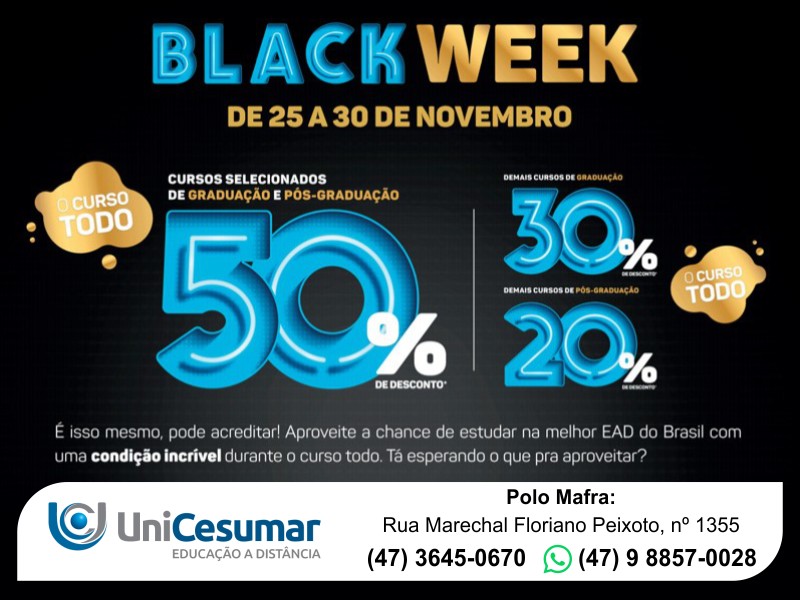 Aproveite a chance de estudar na melhor EAD do Brasil com uma condição incrÃvel durante o curso todo. O polo da UniCesumar em Mafra fica localizado na Rua Marechal Floriano Peixoto, nº 1355. Telefones para contato: (47) 3645-0670 / 9 8857-0028 (WhatsApp).