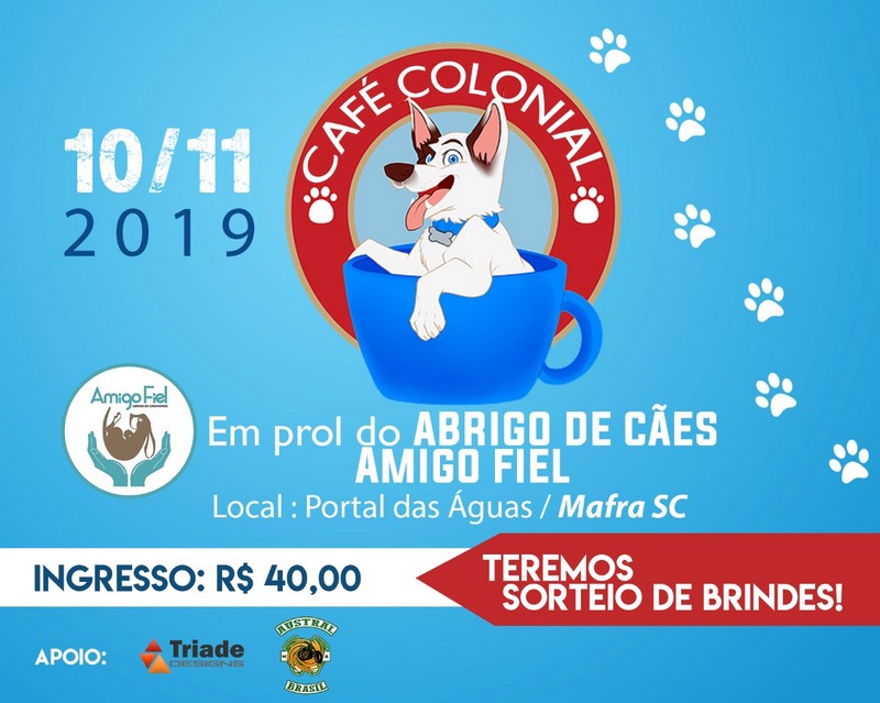 No dia 10 de novembro será realizado o Café Colonial em prol do Abrigo de Cães Amigo Fiel. O evento será no Portal das Águas, na localidade de São Lourenço, em Mafra, e terá início às 14h30. Haverá sorteio de brindes.
