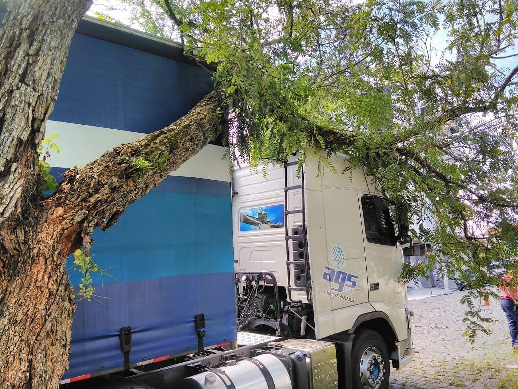 No local foi confirmado o evento e constatou-se que o condutor um masculino ao manobrar seu caminhão Volvo, enroscou a cabine e parte da carreta em um galho de médio porte de uma árvore localizada em calçada pública.