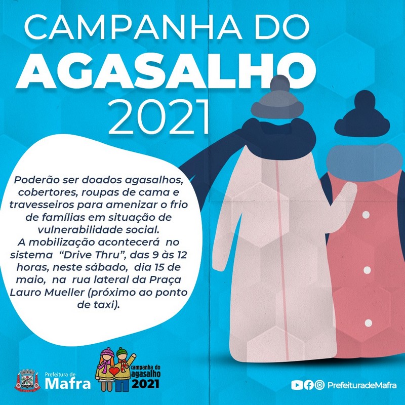 A Prefeitura e Mafra, por meio da Secretaria Municipal de Assistência Social e Habitação, em parceria com a Defesa Civil do município, realizará neste sábado, dia 15 de maio, mobilização para recebimento de doações da Campanha do Agasalho 2021. A mobilização acontecerá no sistema “Drive Thru”, das 9 às 12 horas, na rua lateral da Praça Lauro Mueller (próximo ao ponto de taxi).