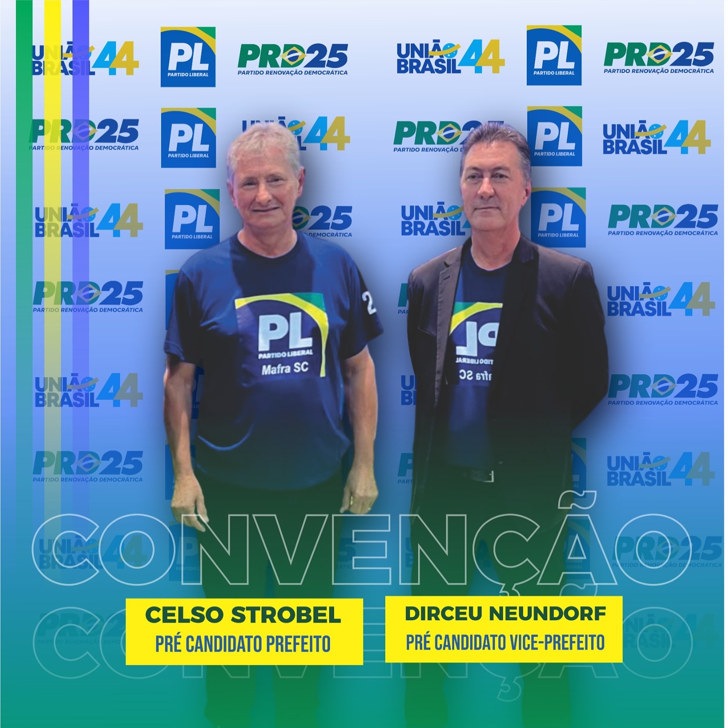 Na última quinta-feira (01) ocorreu em Mafra a convenção do PL, PRD e União Brasil que oficializou a candidatura de Celso Strobel e Dirceu Neundorf aos cargos de prefeito e vice-prefeito respectivamente.
