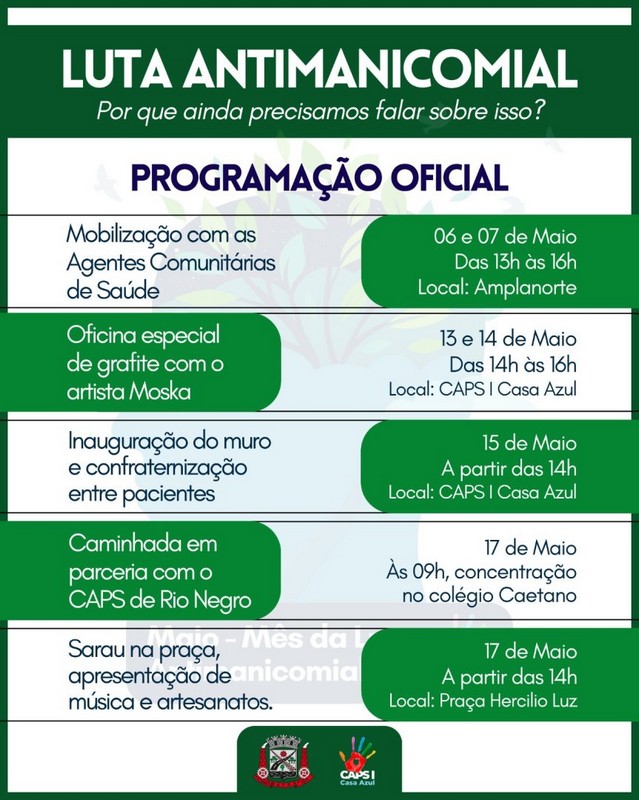 A partir deste princípio, o CAPS I Casa Azul de Mafra desenvolveu uma programação oficial de 6 a 17 de maio, com eventos gratuitos e abertos ao público, a fim de contribuir significativamente para mudanças positivas na forma como a sociedade enxerga e trata as questões de saúde mental.