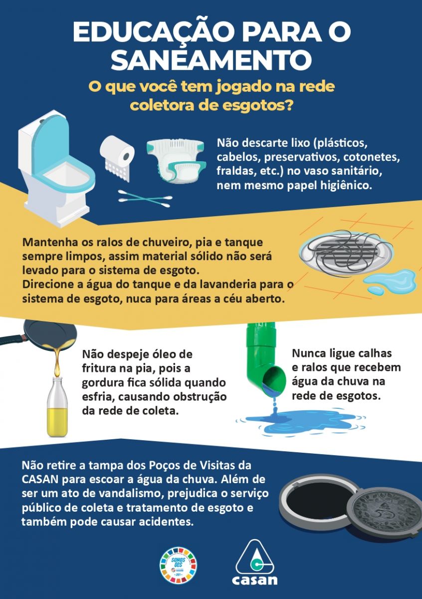 Outro alerta é sobre o descarte de óleo e lixo na rede de coleta de esgoto. ResÃduos como gordura, plásticos, panos, fraldas, tijolos, cabelos e preservativos são os principais causadores de obstruções nas tubulações. Além de bloquear o fluxo nas redes coletoras, esses materiais podem provocar o retorno do esgoto para as ruas e residências, causando transtornos e riscos à saúde.