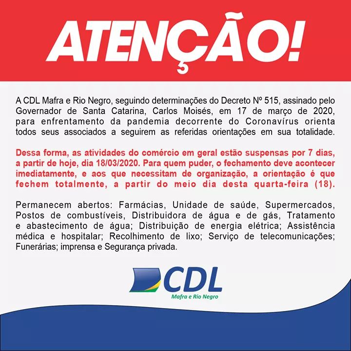 Na manhã desta quarta-feira a CDL divulgou um comunicado sobre o fechamento temporário do comércio em Mafra. Leia: