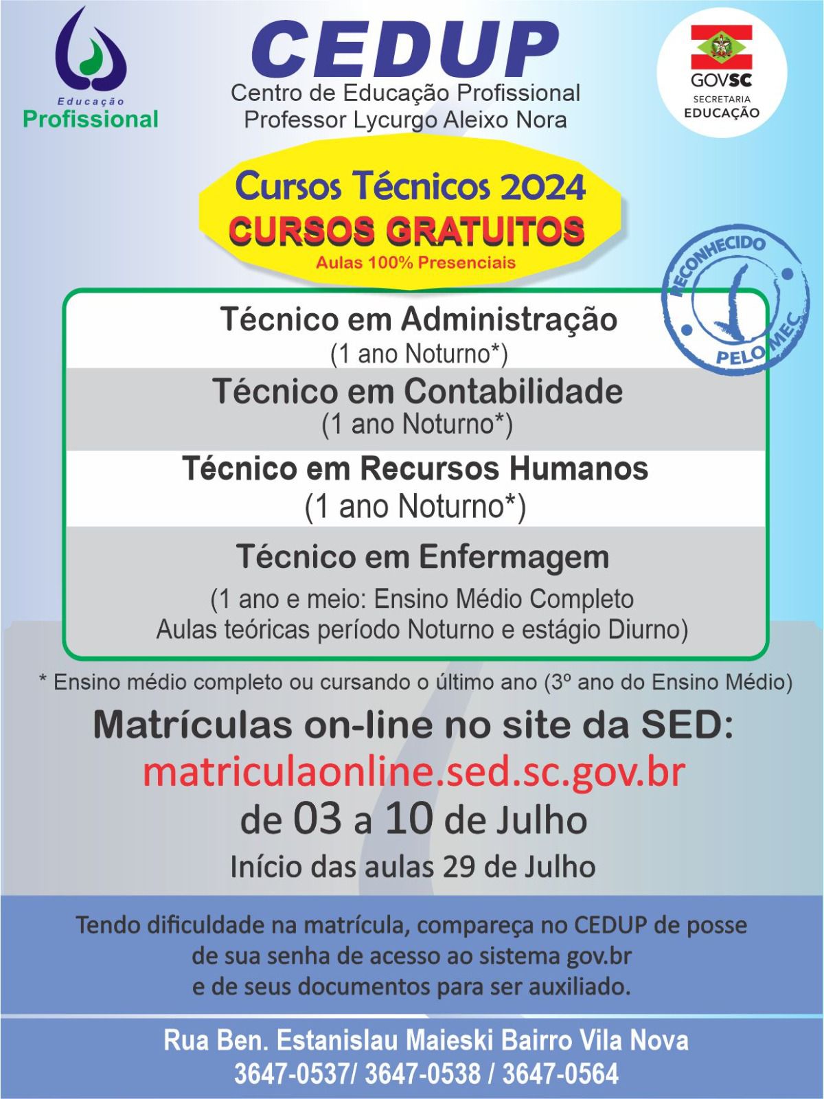 O Centro de Educação Profissional (Cedup) Professor Lycurgo Aleixo Nora está com as inscrições abertas para os cursos técnicos 2024 gratuitos.