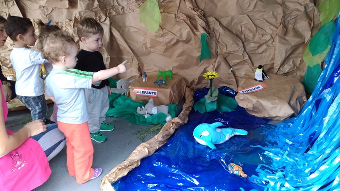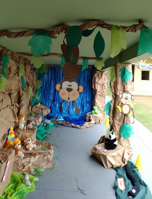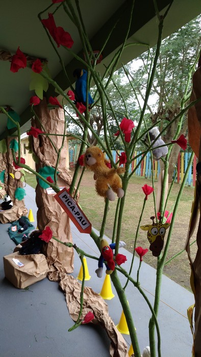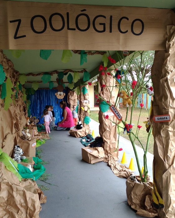 No espaço vago embaixo da escada que leva ao primeiro andar, as professoras Márcia Baruffi e Edinalva Unger Miguel criaram um mini zoológico utilizando papel craft, sacos de lixo e muitos bichos de pelúcia, além de confeccionarem em sala de aula, outros animais selvagens como cobras. Reproduzindo os sons dos animais e com os bichos de pelúcia, o conhecimento foi sendo repassado, bem como informações de que respeitar a natureza é respeitar a si próprio e de que não se pode alimentar os animais nos zoológicos, entre outras.