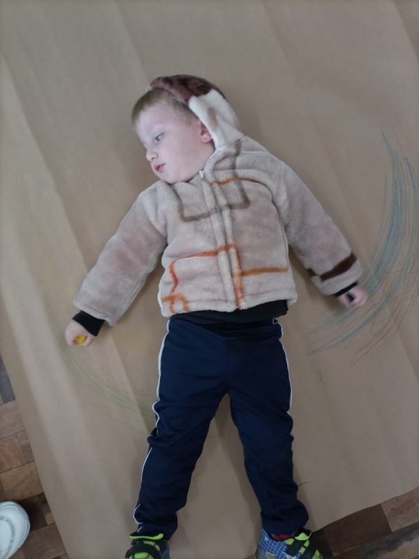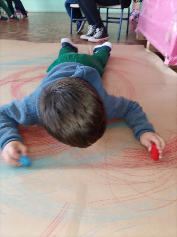 Professora Sandrieli: Iniciei a aula falando sobre como desenhamos e quais ferramentas usamos. Propus aos alunos deitarem sobre um papel Kraft estendido sobre o chão da sala, segurarem um giz de cera em cada mão e explorarem o espaço para desenhar. Deitaram na posição de barriga para cima e para baixo, criando movimentos com os braços. Relacionamos o movimento que faziam, como o vôo de um pássaro, imaginavam estarem voando e assim rabiscando o papel. Ao final do processo cada aluno observava o seu registro. Coletivamente observamos a predominância dos rabiscos circulares.
