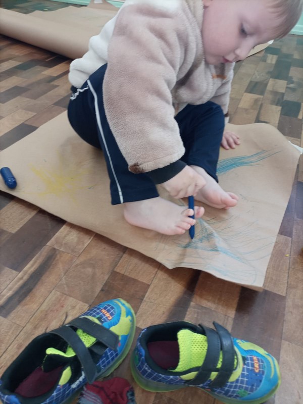 Desenhar, riscar em posições diferentes com movimentos simultâneos explorando o corpo fizeram parte da atividade divertida das crianças