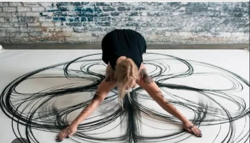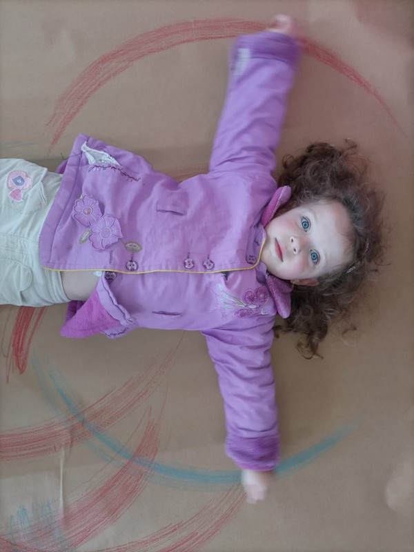 Professora Sandrieli: A artista usa em sua performance, o corpo como ferramenta, carvão e papel sobre uma superfície ampla. Na sala de aula, trocamos o carvão pelo giz de cera, devido a faixa etária. Busquei adaptar a performance a artista o mais próximo do real, para que as crianças tivessem a experiência de desenhar em grande espaço através dos movimentos do seu corpo.