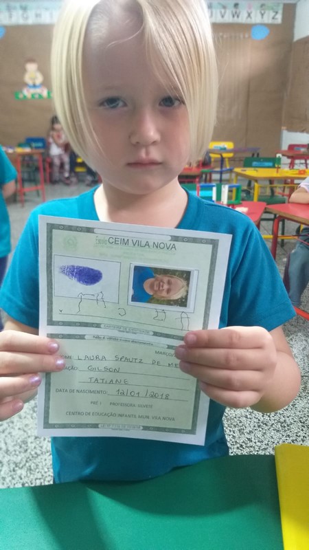 O CEIM Vila Nova está trabalhando em sala de aula com os alunos do Pré I, dos períodos matutino e vespertino, o projeto “Cada nome uma história” com ênfase no tema ‘Eu, você, todos nós’. Desde março, 41 alunos da Educação Infantil estão confeccionando sua Carteira de Identidade (RG), com foto, dados pessoais e assinatura.