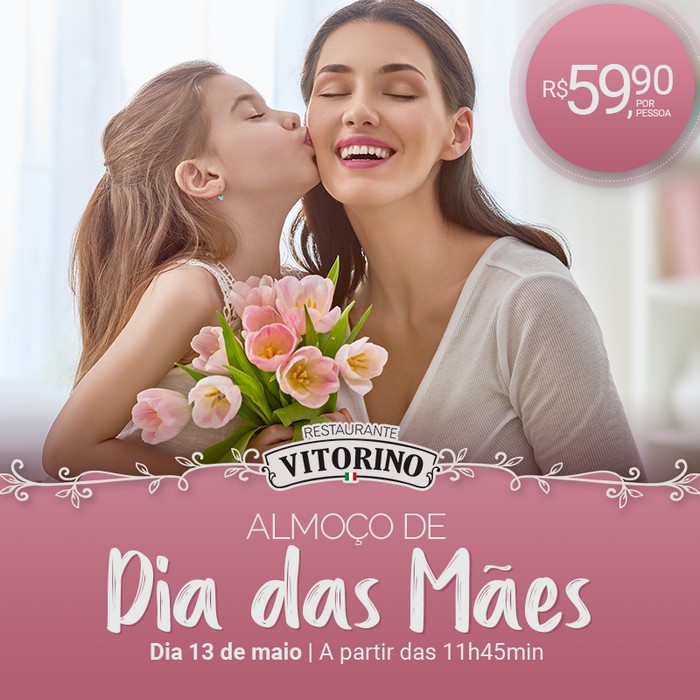 Nesse dia das mães seu almoço tem endereço certo. No Restaurante Vitorino você encontra um cardápio sofisticado, elaborado com ingredientes selecionados para fazer dessa data um momento mais que especial. Vem pro Vito! A partir das 11h45. R$ 59,90 por pessoa.