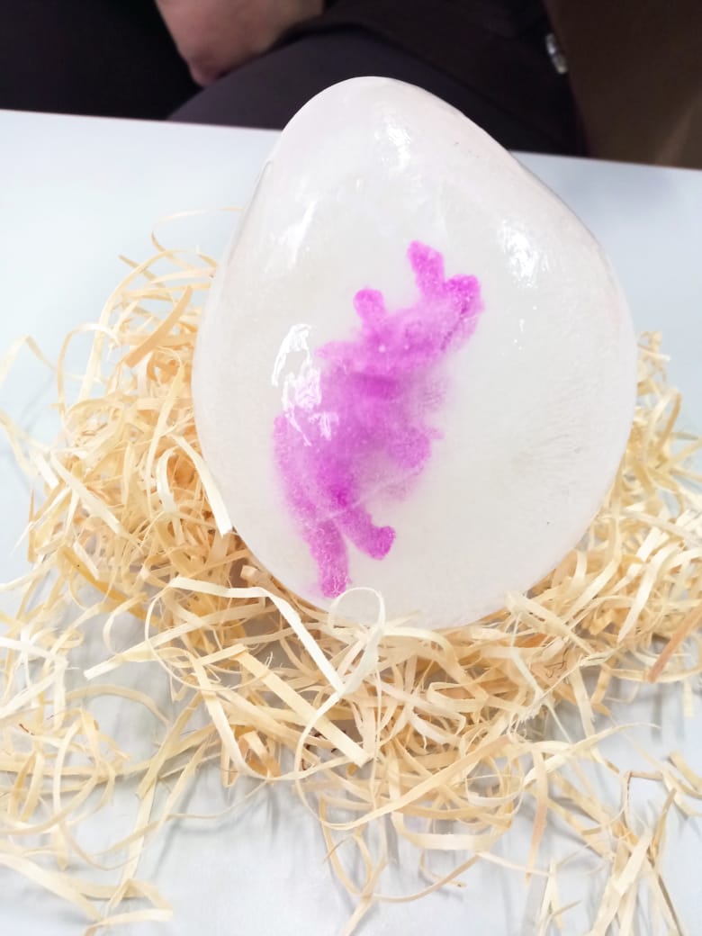 Simone conta que para inserir a atividade no contexto, os alunos assistiram ao vídeo “o ovo do dinossauro” e na sequência foi feito diálogo sobre o vídeo, levando os alunos a concluírem que o dinossauro havia nascido do ovo. Ela explicou em detalhes como foi feita a experiência. “Antecipadamente foi colocado água e um mini dinossauros dentro do balão e em seguida este foi congelado. No dia da atividade foi arrumado o ninho do dinossauro com palha e colocado o ovo, fomos banhando o ovo na água morna e assim nasceu o dinossauro”, explicou.