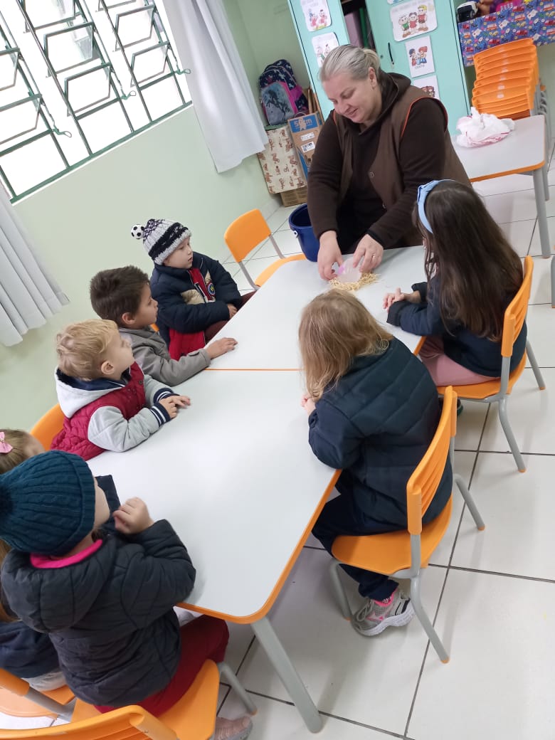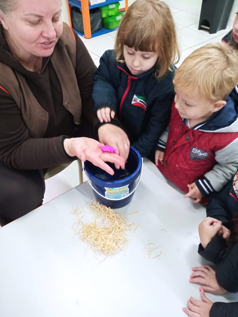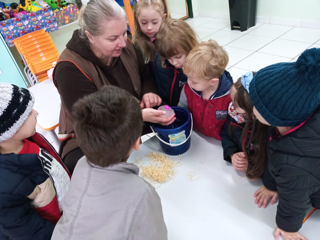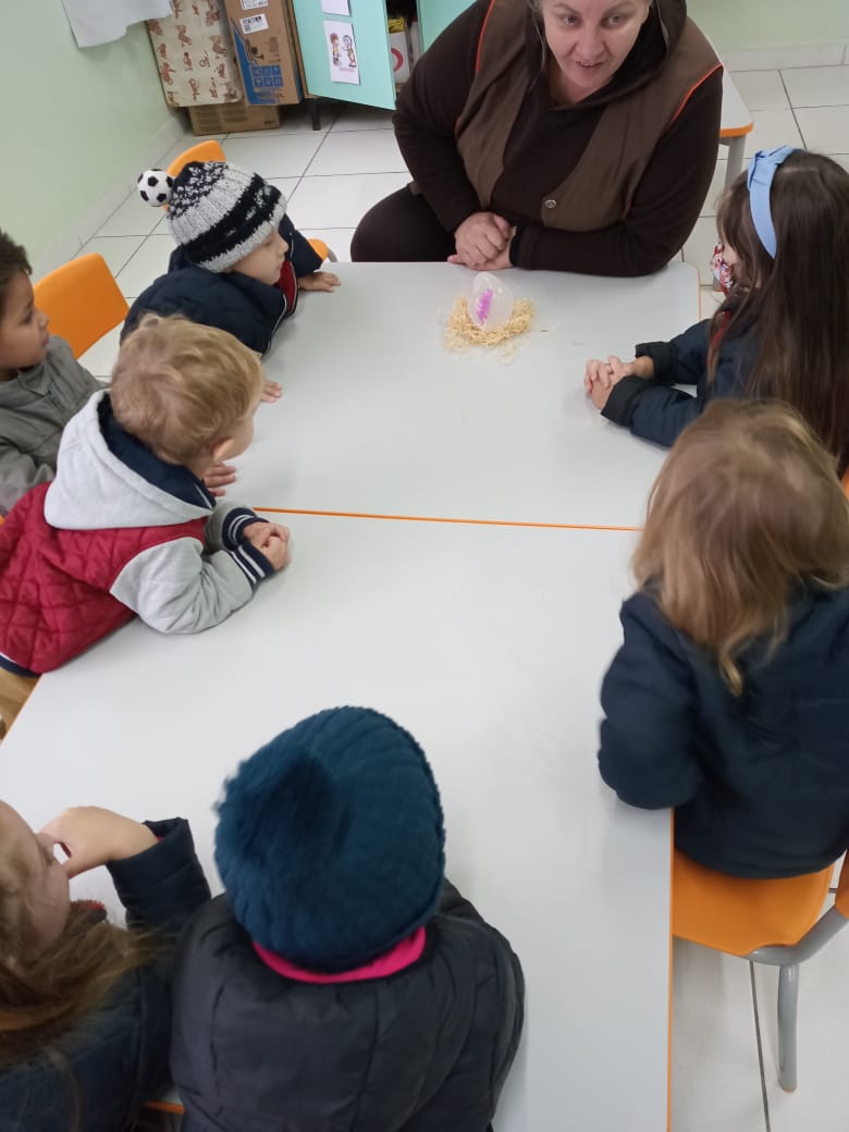 Simone conta que para inserir a atividade no contexto, os alunos assistiram ao vídeo “o ovo do dinossauro” e na sequência foi feito diálogo sobre o vídeo, levando os alunos a concluírem que o dinossauro havia nascido do ovo. Ela explicou em detalhes como foi feita a experiência. “Antecipadamente foi colocado água e um mini dinossauros dentro do balão e em seguida este foi congelado. No dia da atividade foi arrumado o ninho do dinossauro com palha e colocado o ovo, fomos banhando o ovo na água morna e assim nasceu o dinossauro”, explicou.