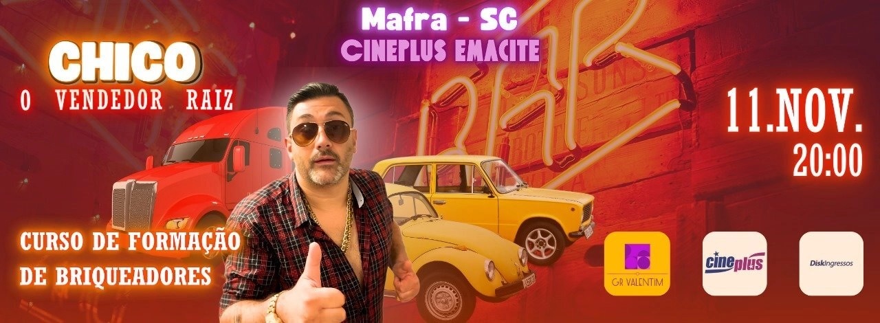 🍿😁 Chico, o Vendedor Raiz, traz seu “Curso de Formação de Briqueadores” para Mafra. O show de humor será nesta segunda-feira às 20h.