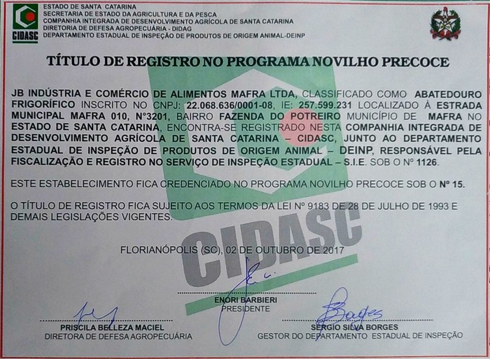 Mais um estabelecimento está apto a abater o novilho precoce no estado. Trata-se do frigorÃfico JB Indústria e Comércio de Alimentos Mafra Ltda. (B’ovino Sul), localizado no bairro Fazenda do Potreiro em Mafra.