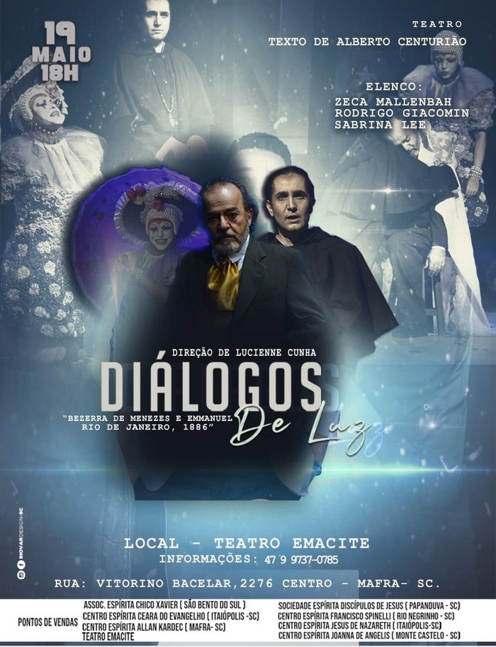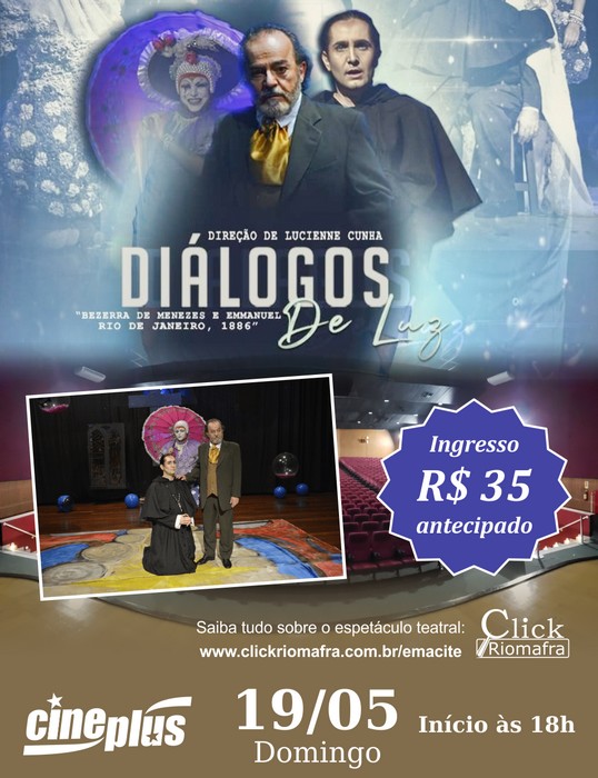 No próximo domingo (19), às 18h, o Cineplus Emacite será palco para o espetáculo teatral “Diálogos de Luz – Bezerra de Menezes & Emmanuel – Rio de Janeiro 1886”, que é inspirado em um fato ocorrido no Rio de Janeiro, às vésperas do Século XX: a relação amistosa entre o Dr. Adolfo Bezerra de Menezes, conhecido à época como “o chefe dos Espíritas” e um sacerdote católico chamado Amaro, ninguém menos que o Espírito Emmanuel reencarnado.