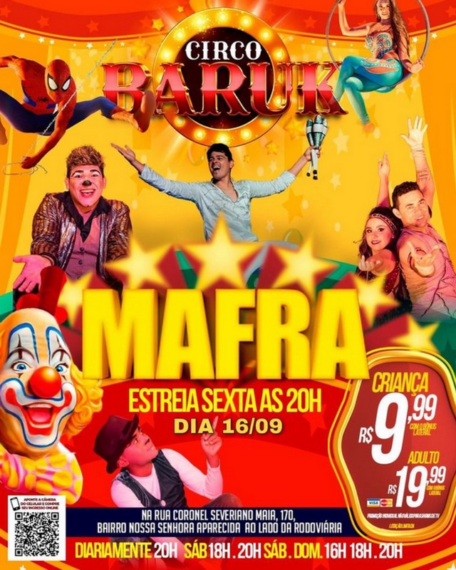 O formidável Circo Baruk está em Mafra! O circo que faz sucesso por onde passa chega pela primeira vez na cidade com um espetáculo inovador e que encanta todas as idades. Ele está armado ao lado da Rodoviária, na Rua Coronel Severiano Maia, nº 170. Confira todas as informações na imagem que vale como bônus (ao tirar e apresentar o print):