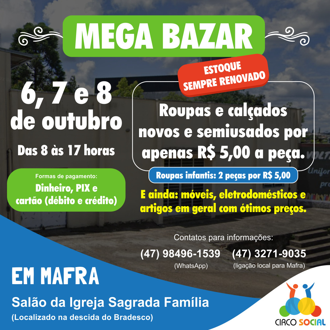 Acontece nesta sexta, sábado e domingo, dias 06, 07 e 08 de outubro, das 08 à s 17 horas, o Mega Bazar Beneficente de Roupas Novas e Seminovas do Circo Social, a ser realizado no Salão da Igreja Sagrada FamÃlia, situado na descida do Bradesco em Mafra.