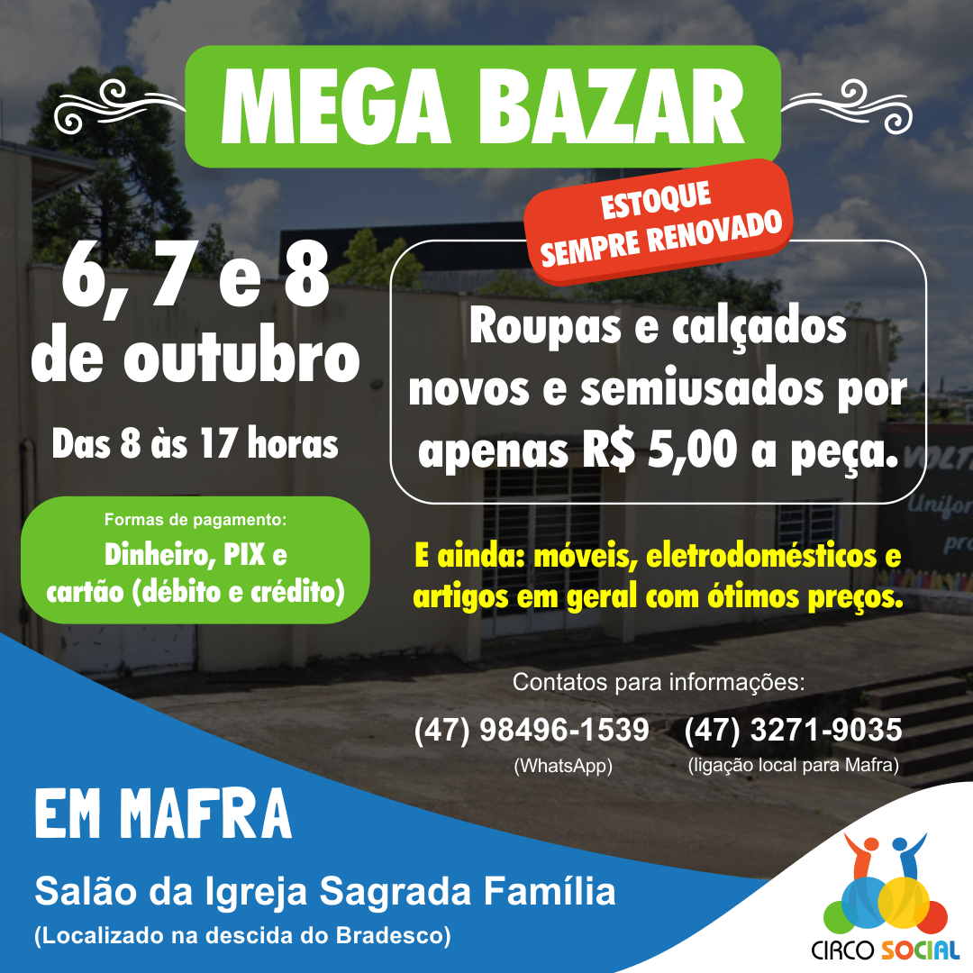 Está programado para os dias 06, 07 e 08 de outubro, das 08h à s 17h, o Mega Bazar Beneficente de Roupas Novas e Seminovas do Circo Social, a ser realizado no Salão da Igreja Sagrada FamÃlia, situado na descida do Bradesco em Mafra.
