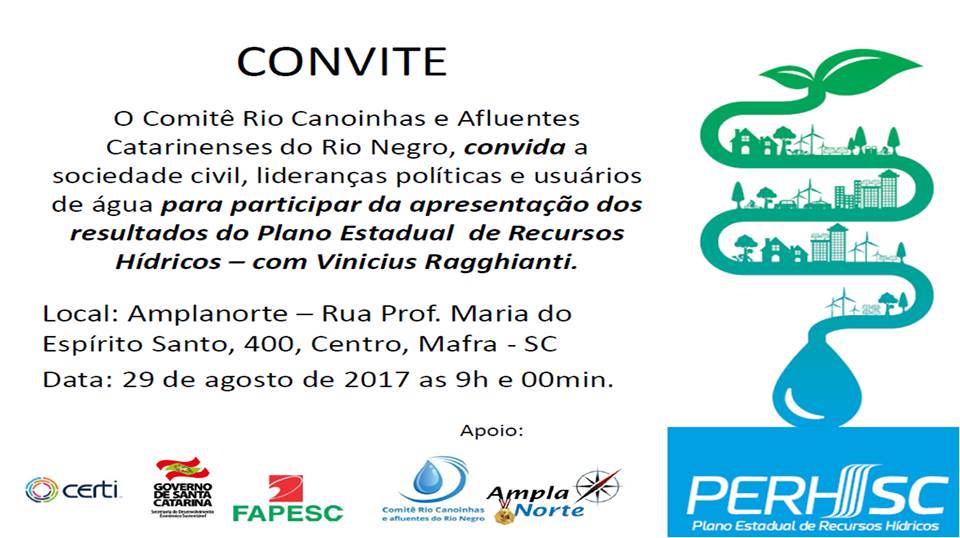 Um dos coordenadores, o engenheiro sanitarista Vinicius Ragghianti vai falar sobre a construção do Plano, que visa garantir o uso racional e a conservação dos recursos hÃdricos catarinenses. A execução do Plano (PERH/SC) foi contratada pela Secretaria de Estado do Desenvolvimento Econômico Sustentável (SDS), com recursos garantidos pelo Fundo Nacional de Meio Ambiente (FNMA).