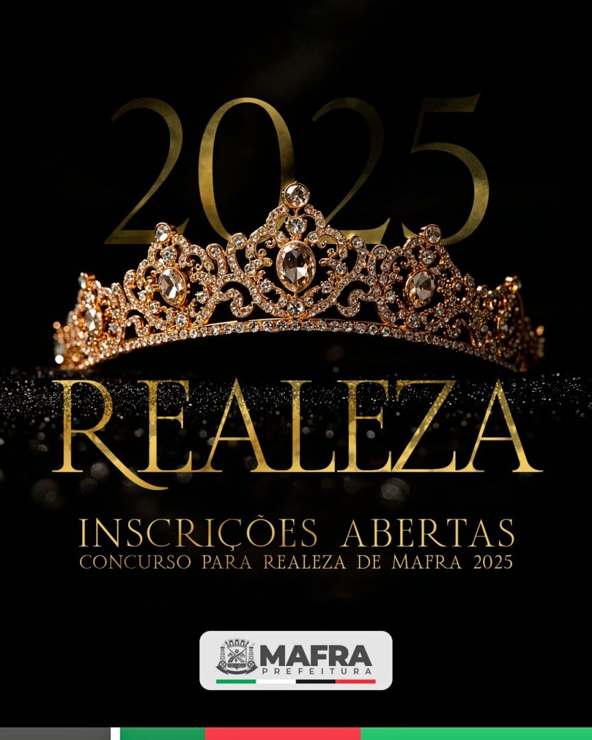 A Prefeitura de Mafra, por meio da Secretaria Municipal de Educação, Esporte e Cultura, está com inscrições abertas para o concurso que irá eleger a Rainha, 1ª e 2ª Princesas em comemoração aos 108 anos do municÃpio. As interessadas podem se inscrever entre os dias 23 de julho e 10 de agosto de 2025, até à s 15 horas, exclusivamente neste LINK.