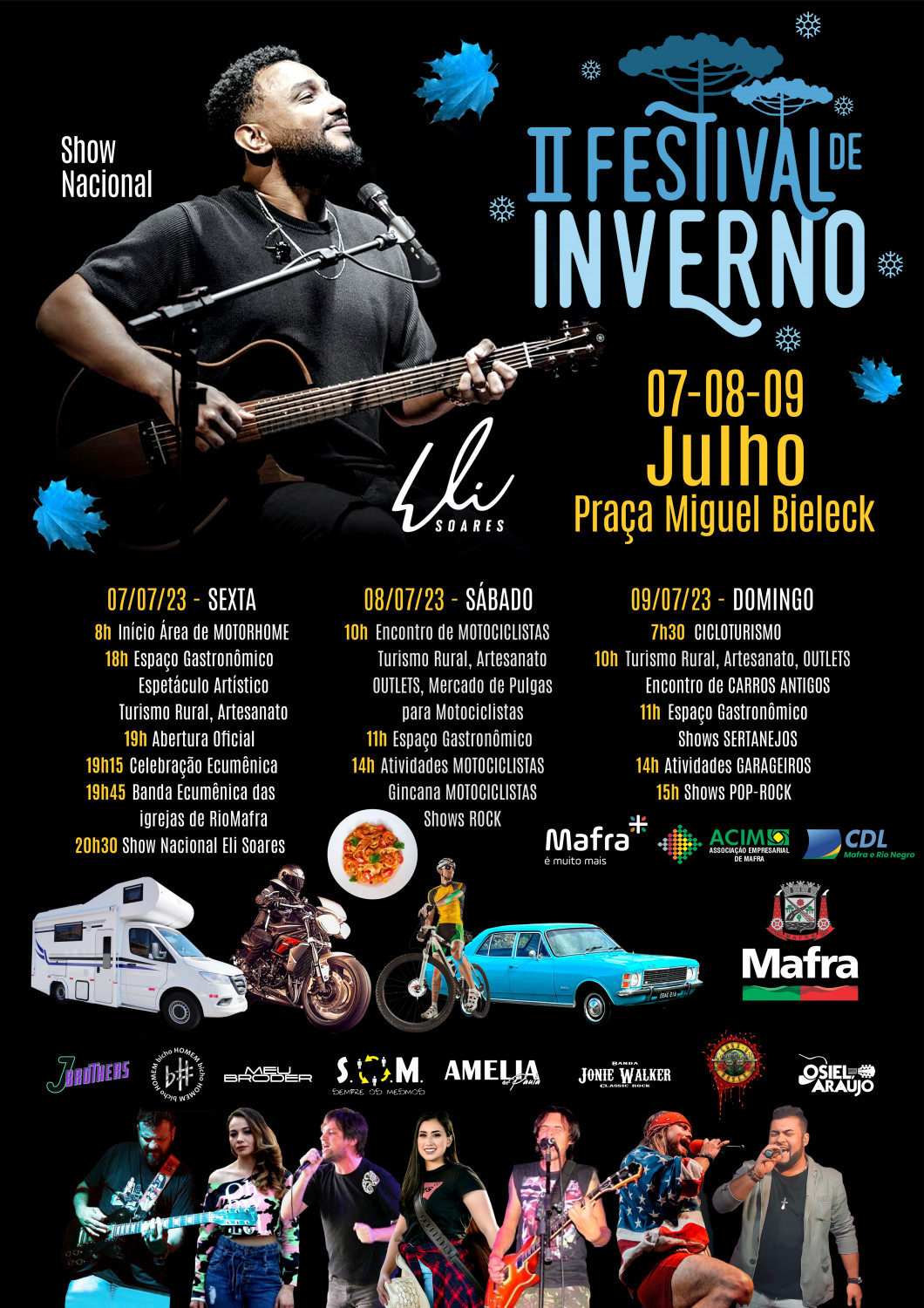 Os preparativos estão a todo o vapor para o II Festival de Inverno de Mafra que acontece nos dias 7, 8 e 9 de julho, na Praça Miguel Bielecki. A realização é da Prefeitura de Mafra, por meio da Secretaria Municipal de Educação, Esporte e Cultura e visa proporcionar lazer para a população mafrense e da região e ainda oportunidades para o fortalecimento da arte, do turismo e do comércio local, além de divulgação e promoção dos artistas locais e regionais. A entrada é gratuita.