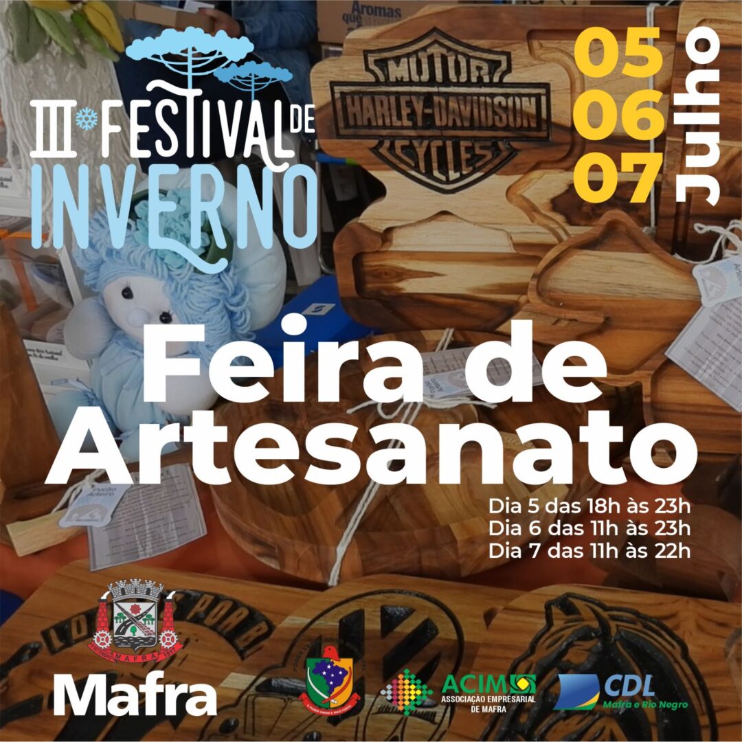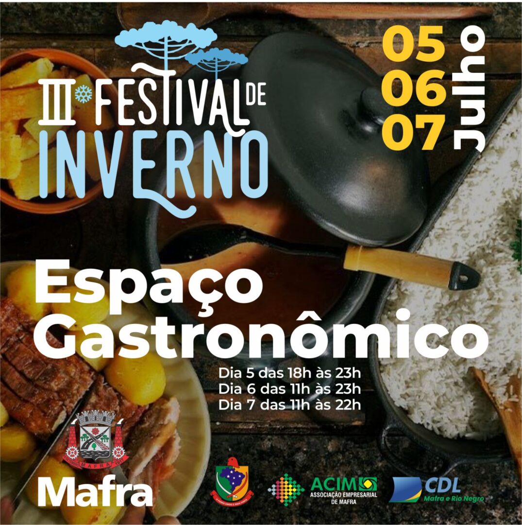 Este evento visa divulgar as potencialidades turÃsticas, gastronômicas e  de artesanato, além de talentos musicais do municÃpio de Mafra. Aliado a todas essas atrações, o III Festival de Inverno proporcionará momentos de lazer para a população mafrense e da região. A Administração Municipal quer repetir o sucesso das outras duas edições, com a participação da população de Mafra, Rio Negro e de toda região.