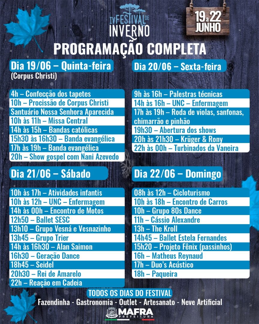 A Prefeitura de Mafra convida toda a população para prestigiar a 4ª edição do Festival de Inverno de Mafra, que será realizada entre os dias 19 e 22 de junho, na Praça Ferroviário Miguel Bielecki. O evento, que já integra o calendário oficial do município, terá entrada totalmente gratuita.