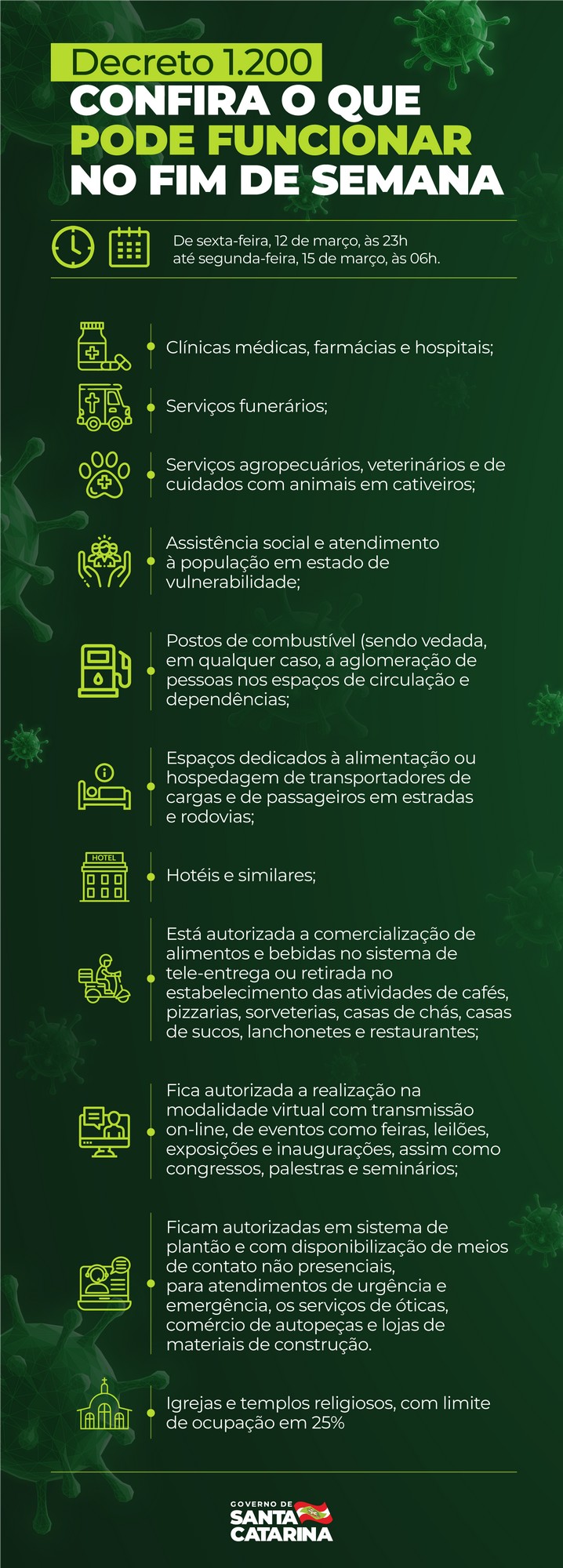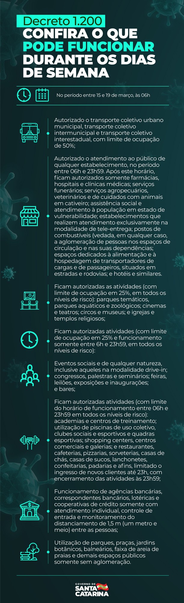 Entra em vigor nesta sexta-feira, 12, o decreto 1.200, do Governo do Estado, com regras e medidas de enfrentamento à Covid-19. Para o fim de semana, haverá mais restrições, elas são válidas a partir das 23h desta sexta até as 6h da próxima segunda-feira, 15. Durante a próxima semana também estão especificadas regras para o funcionamento de atividades, com limites de horário e ocupação.