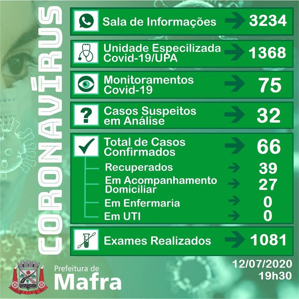 A Sala de Informações COVID-19 Mafra apresenta os dados atualizados (dados de 12/07). Os números da ação Testa Mafra, cujos primeiros 500 testes rápidos foram realizados neste sábado e domingo, ainda não foram contabilizados. Os demais sorteados da área urbana para o teste serão comunicados ao longo da próxima semana. A população do interior pode se cadastrar até o dia 15 pelo site da Prefeitura de Mafra.