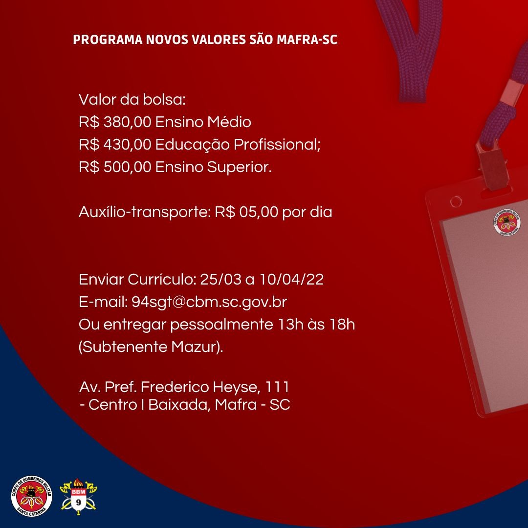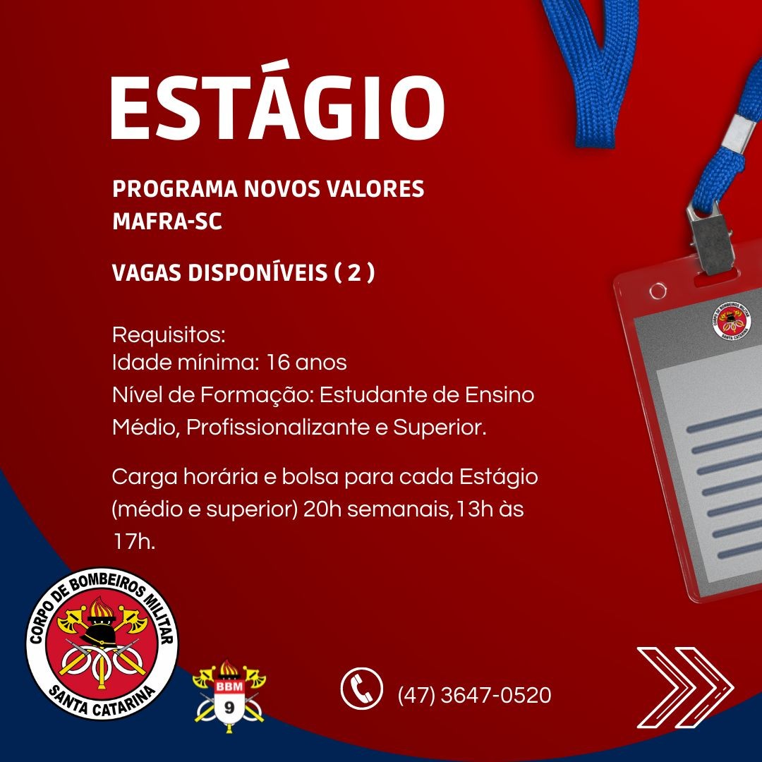 O Corpo de Bombeiros de Mafra abriu vagas para estágio através do Programa Novos Valores. Há vagas para Ensino Médio, Educação Profissional e Ensino Superior com bolsas que podem chegar a R$ 500 por mês. Confira todas as informações na imagem.