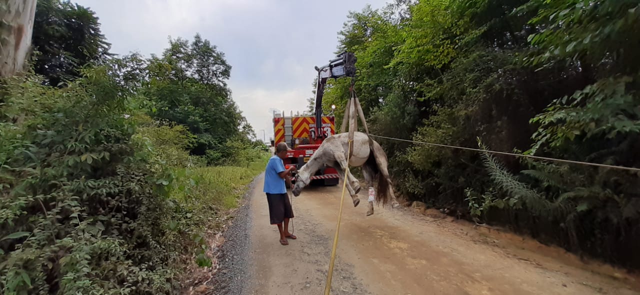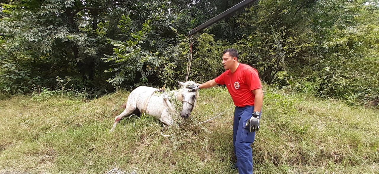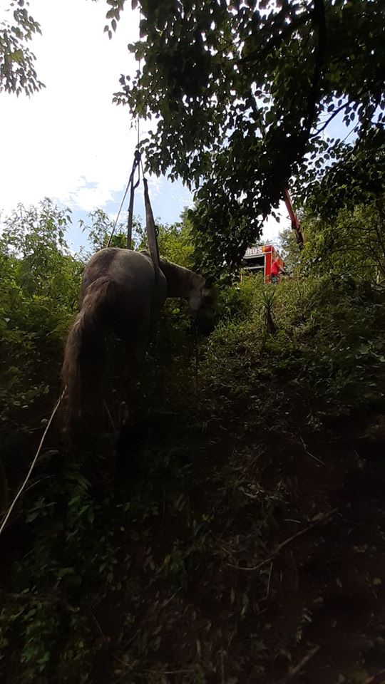 Na manhã desta quarta-feira (29) o Corpo de Bombeiros de Mafra deslocou-se a Rua Brasil, no bairro Faxinal, para realizar o resgate de uma égua tordilha, que se encontrava caÃda em uma ribanceira de aproximadamente 30 metros de profundidade, impossibilitada de locomover-se, apresentando ferimento na perna traseira esquerda com hemorragia severa. Após o resgate do animal, foi realizada a contenção da hemorragia e deixado o mesmo em local seguro aos cuidados do proprietário, sendo ainda informado o fato a PMSC e Prefeitura Municipal para que o setor responsável tomasse as providências necessárias.
