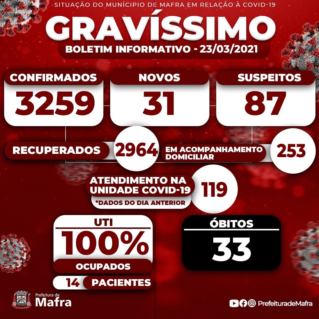 Nesta terça-feira (23) um novo Decreto municipal declara estado de calamidade pública em todo o território de Mafra para fins de enfrentamento à Covid-19. Hoje foram confirmados mais 31 casos positivos. Leia abaixo o Decreto na íntegra.