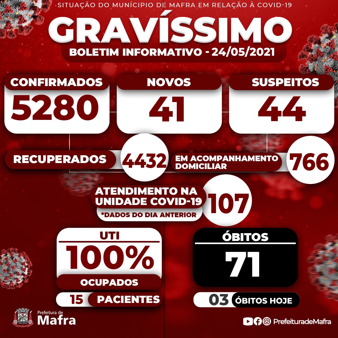 Nesta segunda-feira (24) a cidade de Mafra confirmou mais três óbitos causados pela Covid-19, sendo: paciente masculino, 64 anos que estava na UPA de Mafra, feminina de 63 anos que estava internada no hospital de Canoinhas e uma feminina de 28 anos que estava no hospital de Brusque.