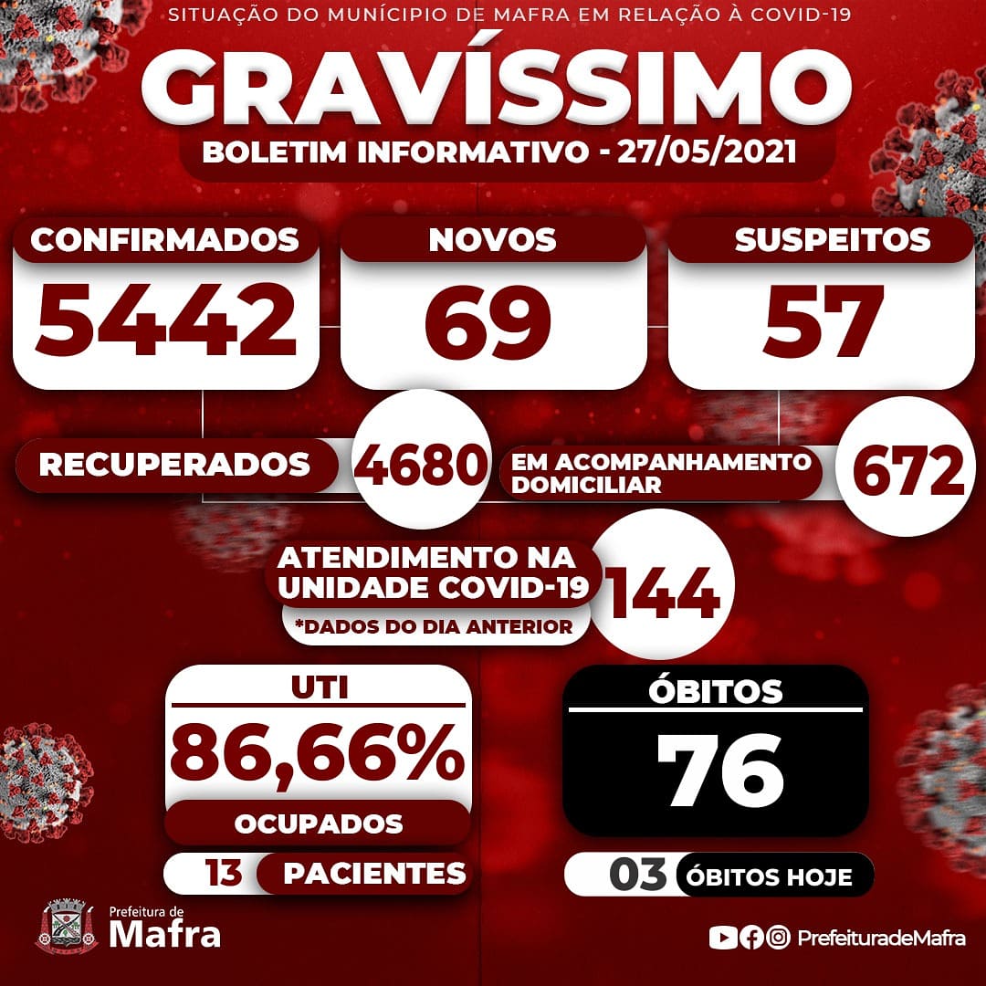Nesta quinta-feira (27), a cidade de Mafra registrou 69 novos casos de Covid-19 e 03 óbitos, sendo pacientes masculinos: com 36 anos (estava em hospital em Florianópolis); 28 anos (estava em hospital em Rio Negrinho) e 77 anos (em domicílio).