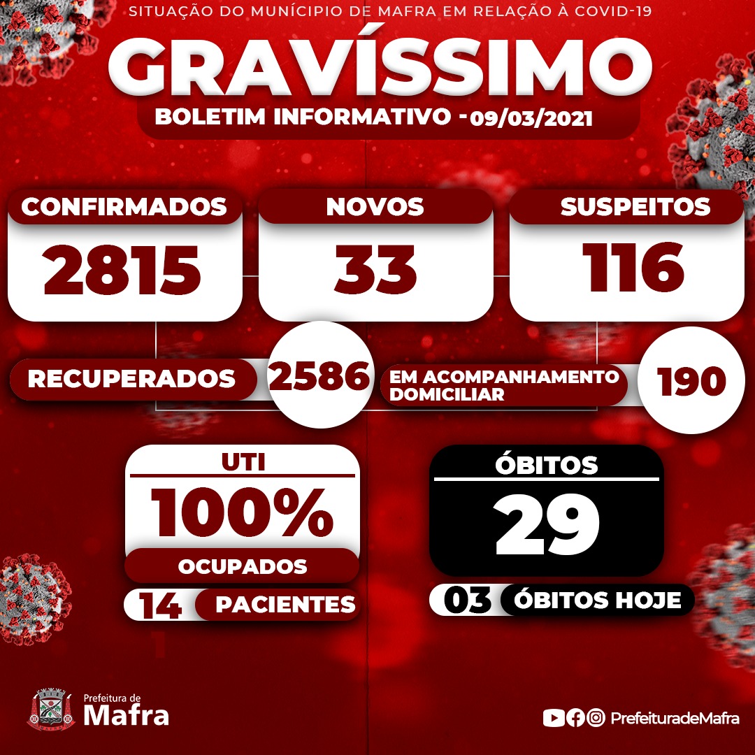 Nesta terça-feira a cidade de Mafra registrou 33 novos casos de coronavÃrus e mais três óbitos, sendo eles: